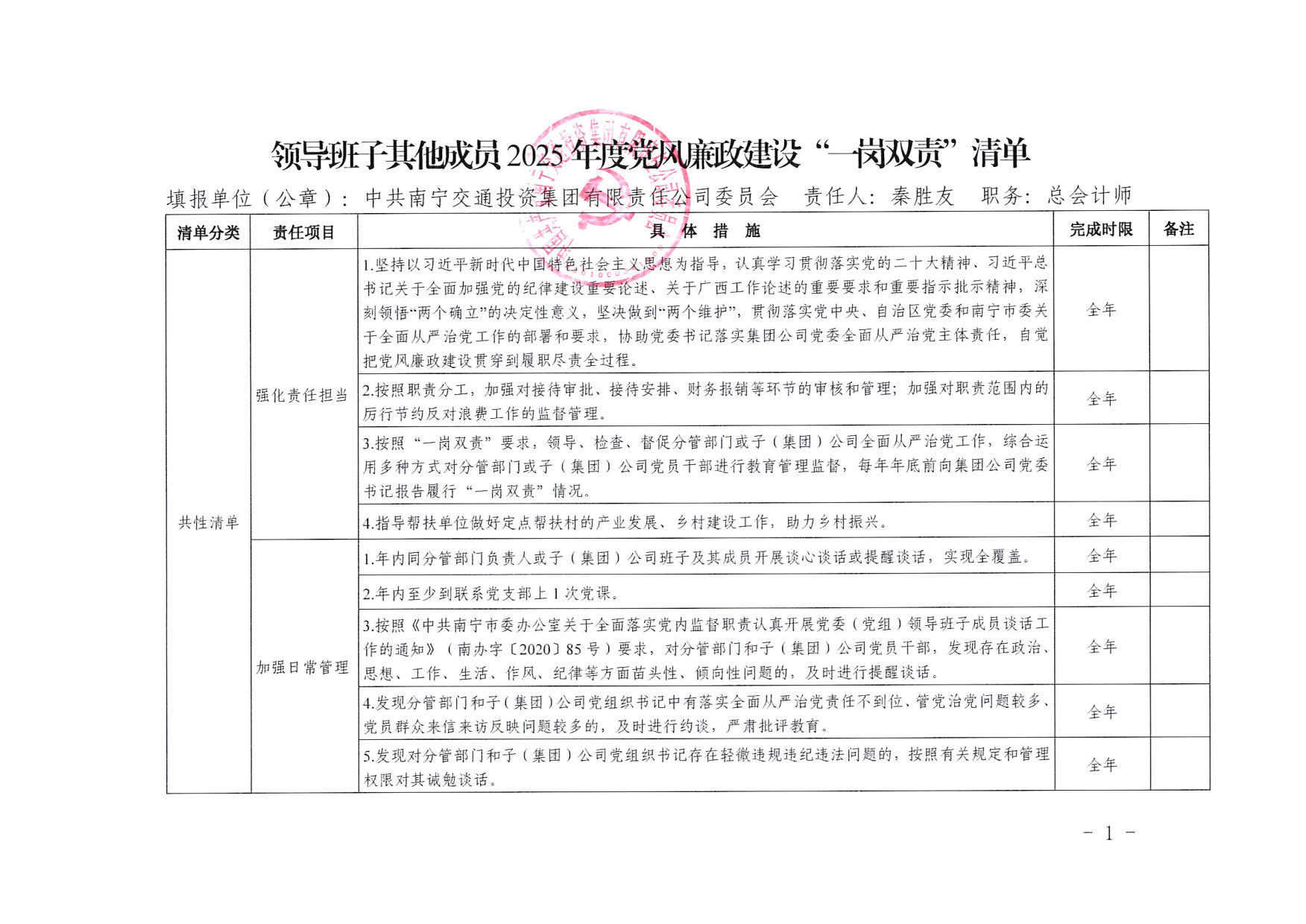 南寧交投集團(tuán)領(lǐng)導(dǎo)班子其他成員2025年度黨風(fēng)廉政建設(shè)“一崗雙責(zé)”清單(七)
