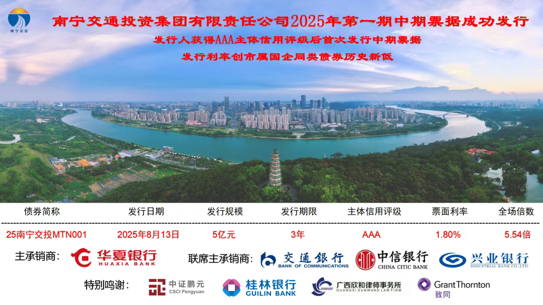 憑借良好的經(jīng)營業(yè)績、穩(wěn)健的財務表現(xiàn)和優(yōu)異的發(fā)展前景,8月13日,南寧交投集團成功發(fā)行2025年度第一期中期票據(jù),發(fā)行金額5億元,期限3年。